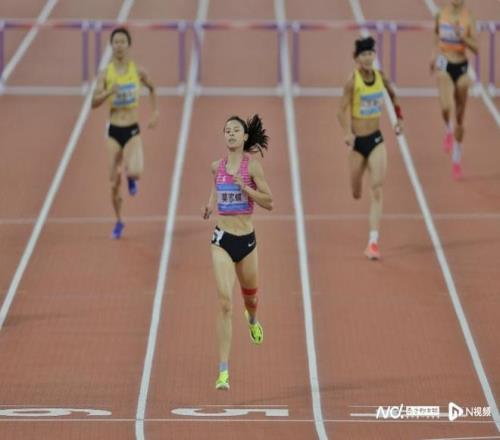 莫家蝶在十五运会女子400米栏决赛中以绝对优势夺冠。南都N视频记者 黎湛均摄